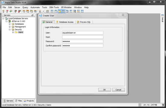 Host: <leave blank> So that Aqua Data Server can access the database regardless of whether the database is installed on the same physical server as the Aqua Data Server application, or on a remote server elsewhere on your network. Make sure you complete the Database Access tab before clicking OK.