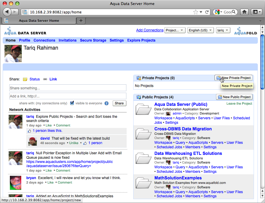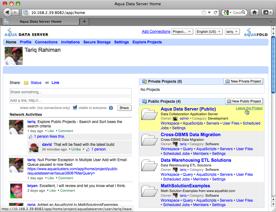 Most of the user created content in Aqua Data Server exists in the context of a Project. As a user, your access is restricted to projects that you own or are a member of. The Projects area displays on the right side of the User Home page and lists every project you are a member of. The areas of the projects you have access to (Workspace, Query, AquaScripts, Servers, User Files, Scheduled Jobs, Members or Settings) display as links so you can quickly navigate directly into the section of that project you need to work with. On this page:
