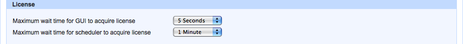 Timeout when license acquired for a scheduled action (when an AquaScript is executed by the Scheduler). Set as 15 seconds, 1 minute, 5 minutes, 30 minutes or 1 hour. If a license is not acquired within the specified amount of time, the scheduled AquaScript execution fails and an error is logged in that job's execution history. The log can be viewed by clicking on the job's name in the Project->Scheduled Jobs tab, or Admin->Scheduler tab.
