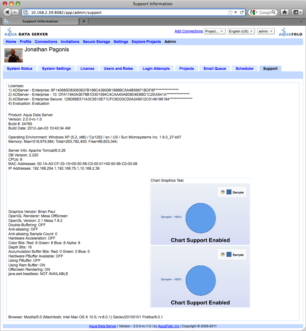 In order to quickly and effectively solve problems, having some key information about the environment is very helpful. Hence, we request that you supply us with this information any time you contact support. The first section, licenses, lets us quickly retrieve your history and determine if other users in your company have encountered similar issues. The next set of sections tell us about your operating environment, both hardware and software and the version of Aqua Data Server you are running. Finally, the charting section tells us whether charts are being successfully rendered and whether a hardware or software renderer is being used.