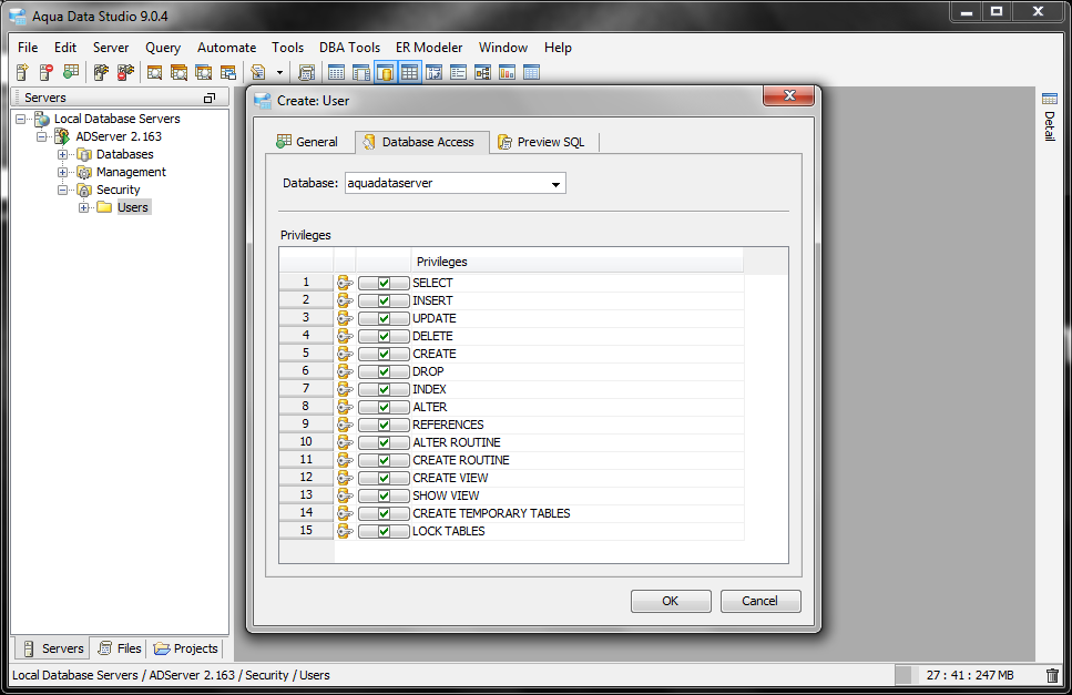 2. Create a database user 'aquadataserver' and grant this user all privileges to the aquadataserver database.