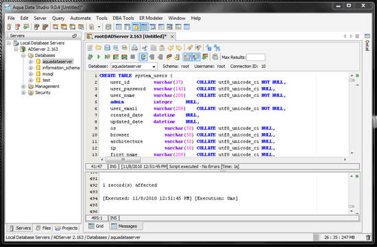 Below is an example of the aquadataserver_schema.sql script within Aqua Data Studio. After the SQL script is executed, all of the needed schema are created and ready for use.