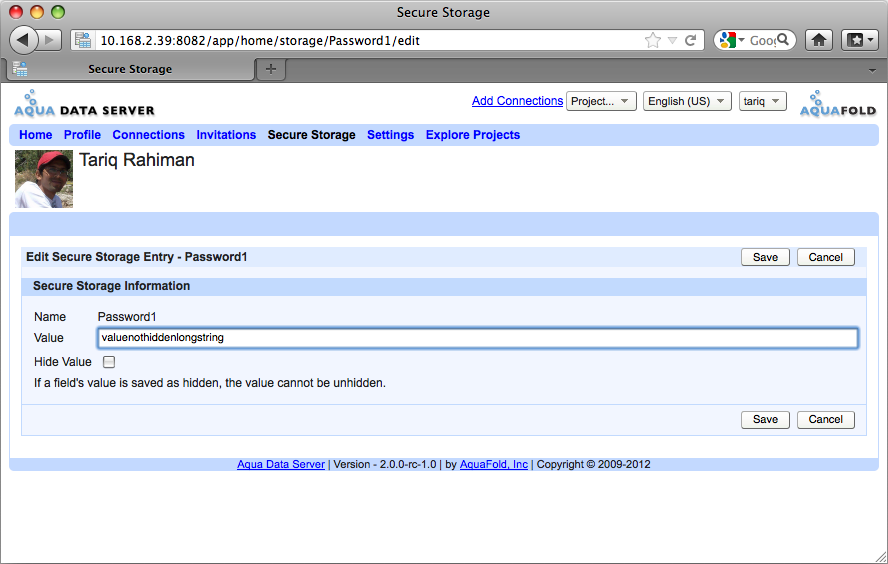 When writing AquaScripts you might have a need to authenticate with a 3rd party system such as an email server. It is not recommended specify the password in the AquaScript because it would be there in plain text and anyone with access to that AquaScript could view it. To address this need, Aqua Data Server has created the concept of Secure Storage fields. Secure Storage fields are name value pairs where the value is stored in an encrypted format. You can create and manage these fields in the Secure Storage tab. These fields are only accessible by you and are not shared amongst other users. Even system administrators cannot access your secure storage fields. See Basic Concepts: Secure Code to learn more about how to use these fields in your AquaScript code.