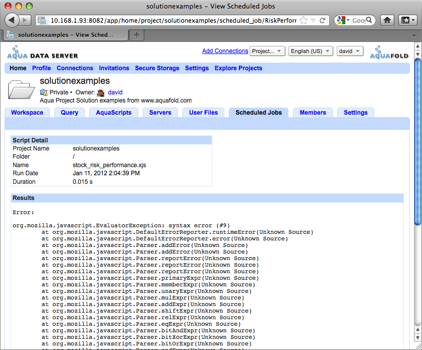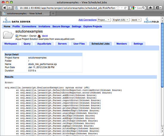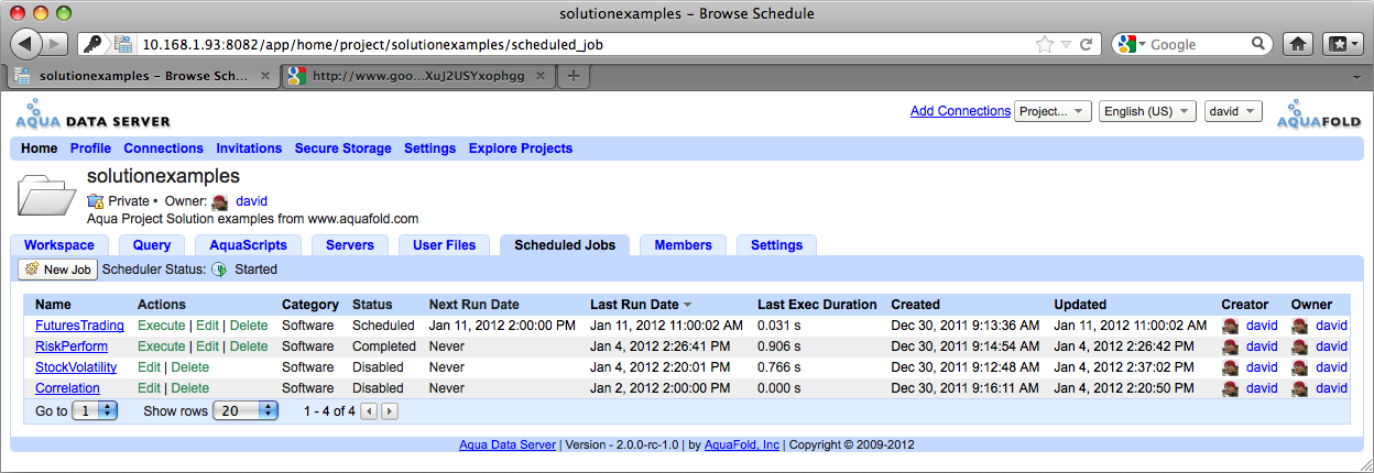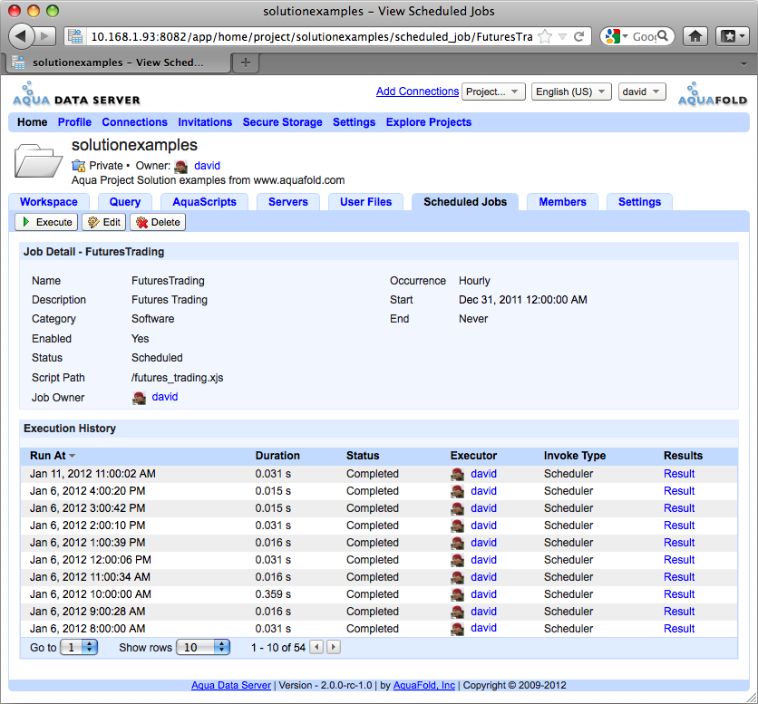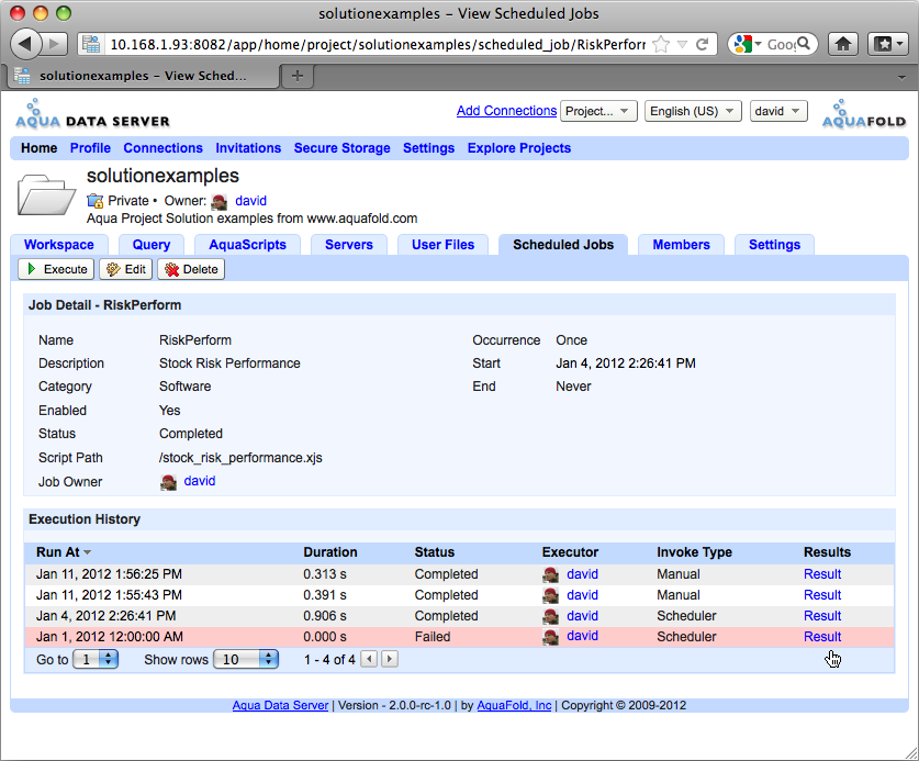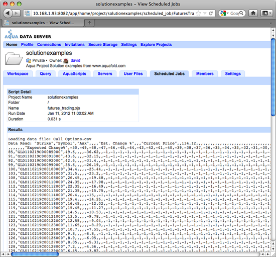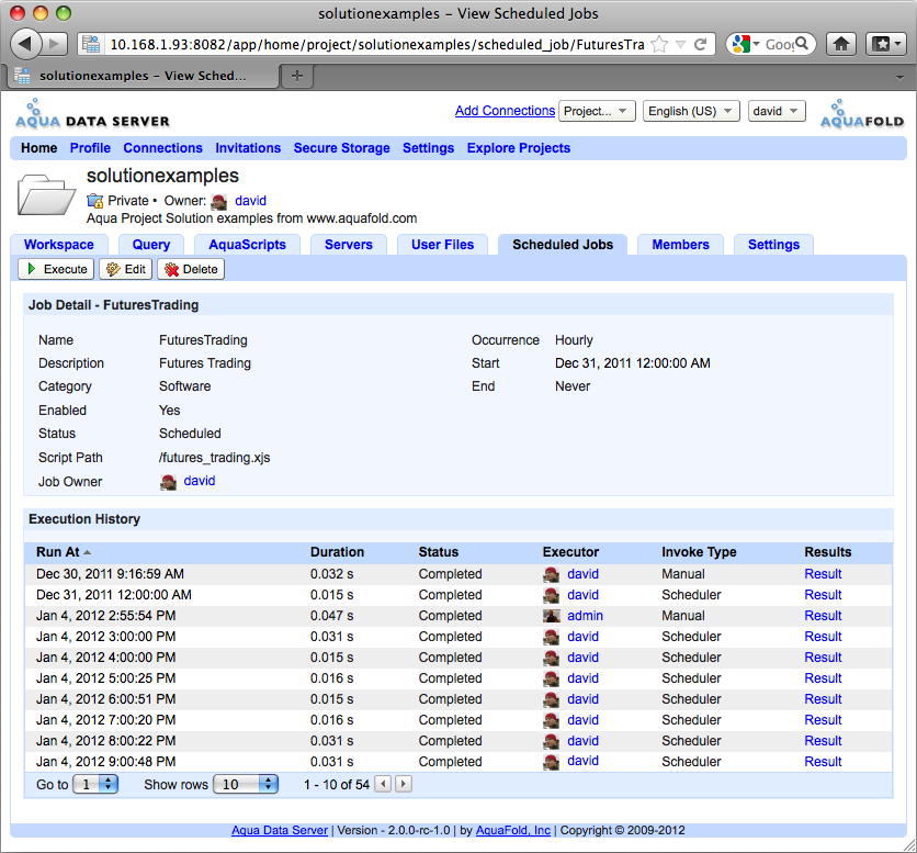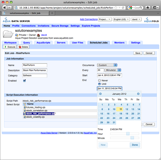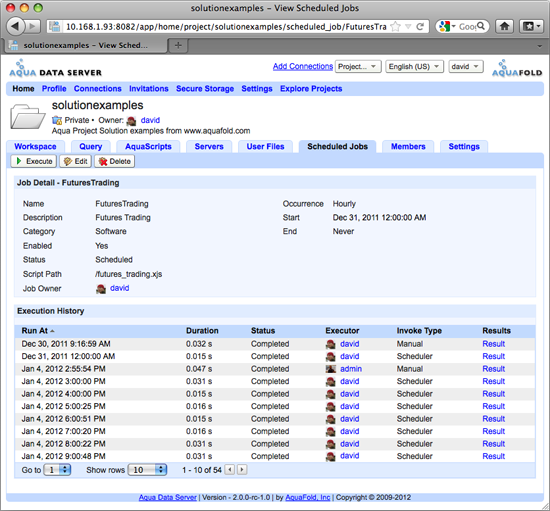 After you have developed production ready AquaScripts, you might want to execute some of them on a periodic basis or in a background thread. Aqua Data Server's scheduled job functionality is designed to address these requirements. In a scheduled job, you specify the AquaScript to run and how often the AquaScript should be executed. Aqua Data Server's Scheduler engine automatically invokes the AquaScript at the designated time. Once the script is finished executing, you can view its execution history and its results. One use case might be that you need to send a daily status report on the number of outstanding orders. You could create an AquaScript that queries the database to get the number of outstanding orders, graph the data, embed it inside of excel and emails it to your manager all using the Aqua Open APIs. You could then create a scheduled job to run this report on a nightly basis. On this page: