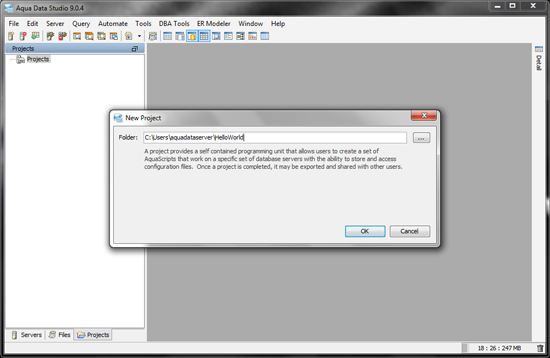 5. Click the “OK” button, and Aqua Data Studio will create a new folder called “HelloWorld” in the “C:\Users\aquadataserver\” directory.