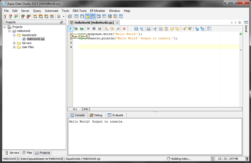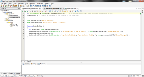 The “Hello World” project can be downloaded from the AquaFold website and imported to Aqua Data Studio. You will not need to create a new project nor write any AquaScript code.