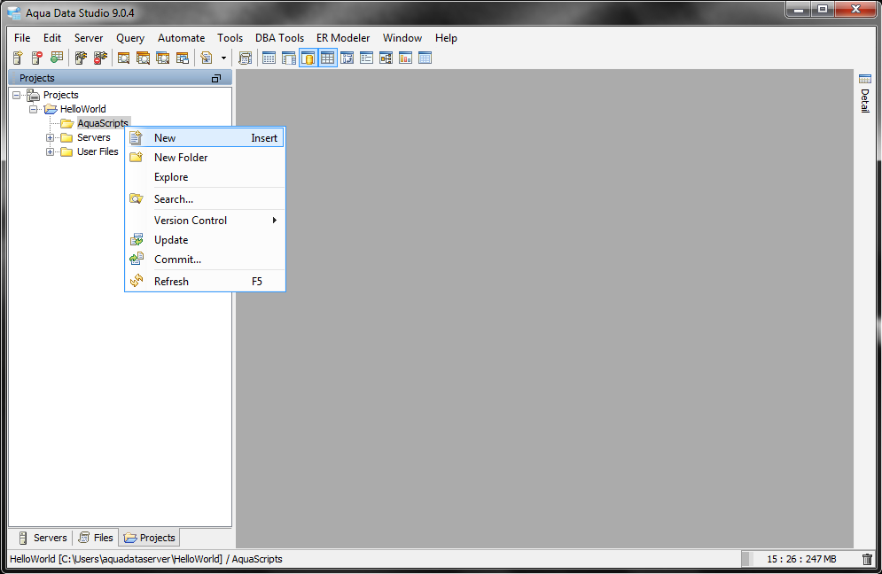Aqua Data Studio will also automatically create three sub-folders in the “HelloWorld” folder, named “AquaScripts”, “Servers” and “User Files” as shown in the screen shot below.