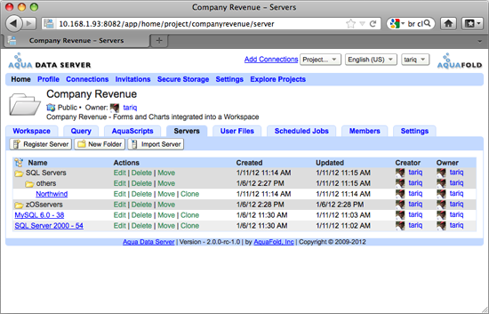 You can create , edit, move and delete Servers, similar to the way you would manage files in your OS. You can also view the contents of a Server by clicking on its name. This will provide you a read-only view of the Server Registration dialog. If certain actions are not available, then you do not have the necessary project permissions.