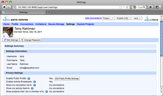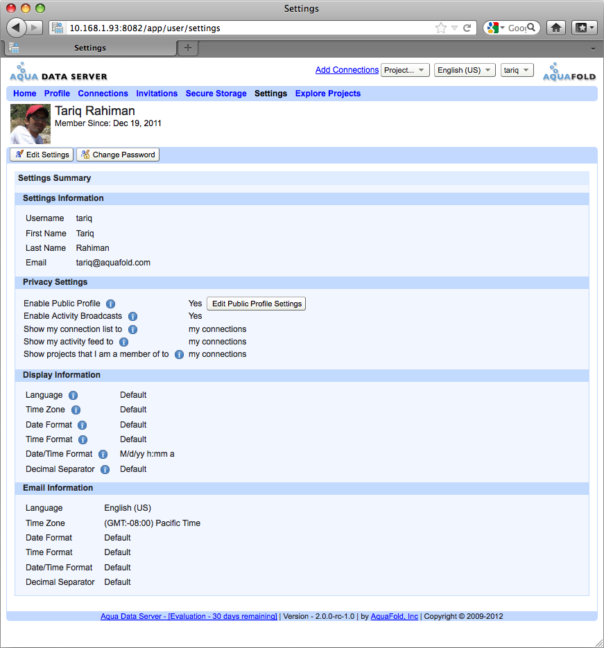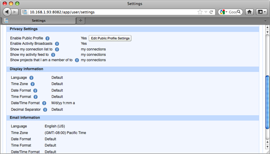 Users change their password, control their Privacy Settings, Display Information (Language and Date/Time Format) and Email Information through the Settings link, which is always visible to them in the Title Bar while they are logged in. On this page: