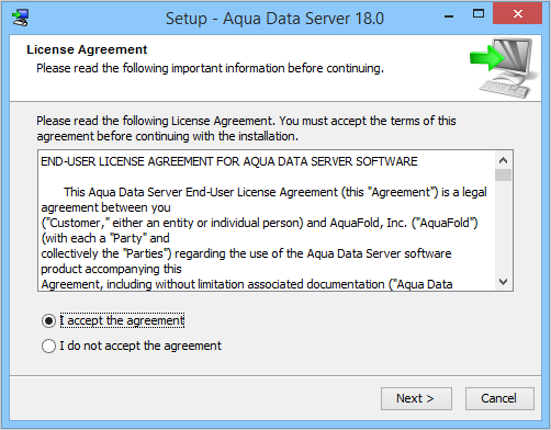 Download the Aqua Data Server installer EXE file from http://www.aquafold.com/aquadataserver_downloads.html to the desktop and double click it.