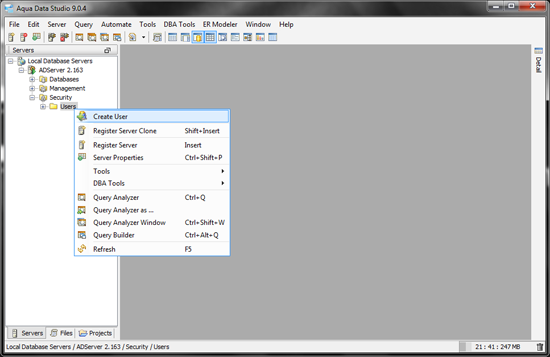 This step is for creating the appropriate schema within the aquadataserver MySQL database needed for running Aqua Data Server. Below, all of the steps assume you will be using Aqua Data Studio for creating and configuring the repository. If you do not have Aqua Data Studio, you can download a free evaluation version http://www.aquafold.com/aquadatastudio_downloads.html. If you are not using Aqua Data Studio, click here for Command-line MySQL Repository Creation Step Create Database.