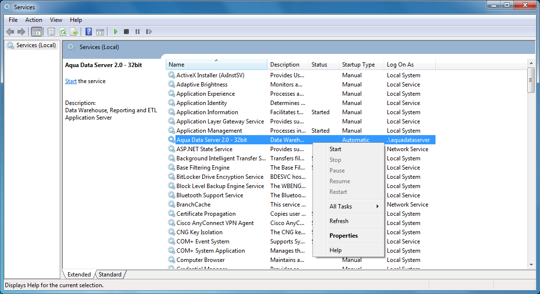 You should still have the Services list open. Right click on the Aqua Data Server service again, then choose Properties again.