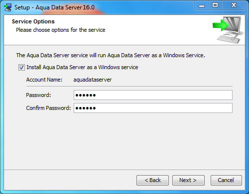 Click next to select Service options for creating a Windows Service to run Aqua Data Server. The service will run under the Windows user account you are currently logged in as. Enter aquadataserver's Windows password.