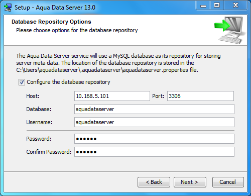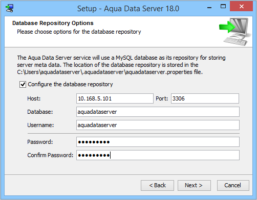 Next, indicate the host IP address and password to be used by the mysql database installed in step 2. The Host field must match the bind-address entered in the my.ini file in this prerequisite MySQL step. "Create the Repository" above. This points Aqua Data Server to the correct database and sets this information in the <SERVICE_USER_HOME>\.aquadataserver\aquadataserver.properties file. If your MySQL installation is on a server at a different IP address than where you've installed Aqua Data Server, enter that IP in the Host field.