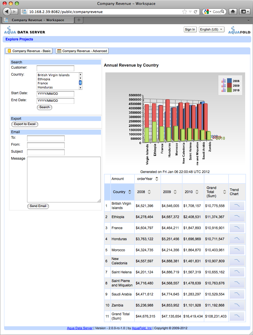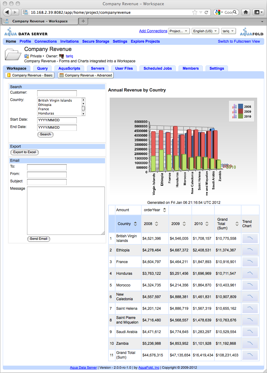 As an AquaScript developer, you might want to create AquaScripts that require user input and/or display output to the user. The Workspace tab is the place where users can view the output of and interact with your script. For example, as shown in the screenshot below, a developer has created a report that displays the company's annual revenue by country and provides the ability to filter and export the data. When a user clicks on the "Company Revenue" project from his My Projects page, he is immediately taken to the project's workspace (View Workspace Project Permission required) and can view the script's output and interact with the report.