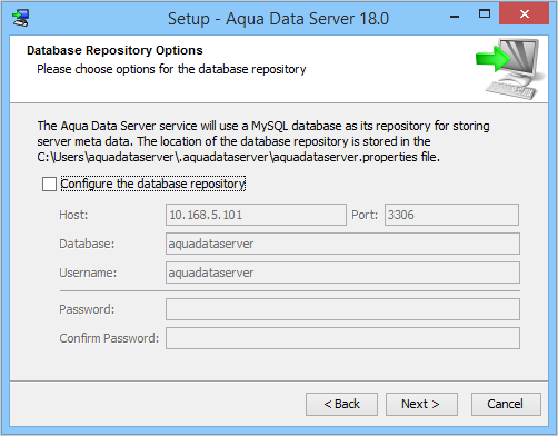 In the "Database Repository Options," make sure the checkbox is unchecked so that your aquadataserver.properties file is not changed (this means the existing database from Aqua Data Server v17.0 will be used for Aqua Data Server v18.0). Click Next.