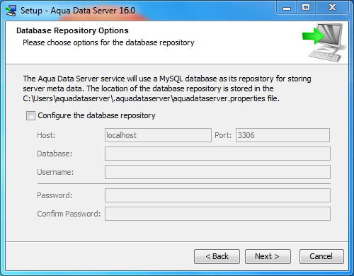 You will then need to indicate the database repository location by editing the aquadataserver.properties file as explained in the Database Repository Configuration section.