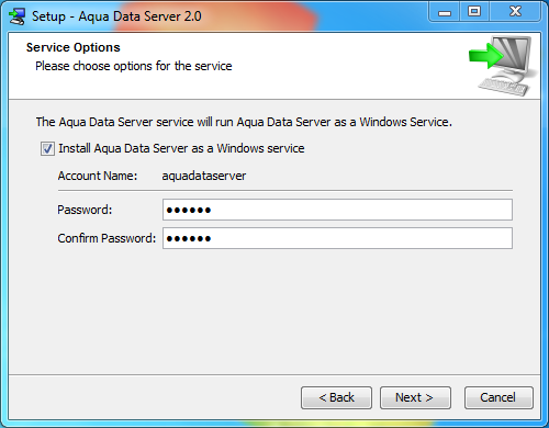 Click next to select Service options for creating a Windows Service to run Aqua Data Server. The service will run under the Windows user account you are currently logged in as. Enter aquadataserver's Windows password.