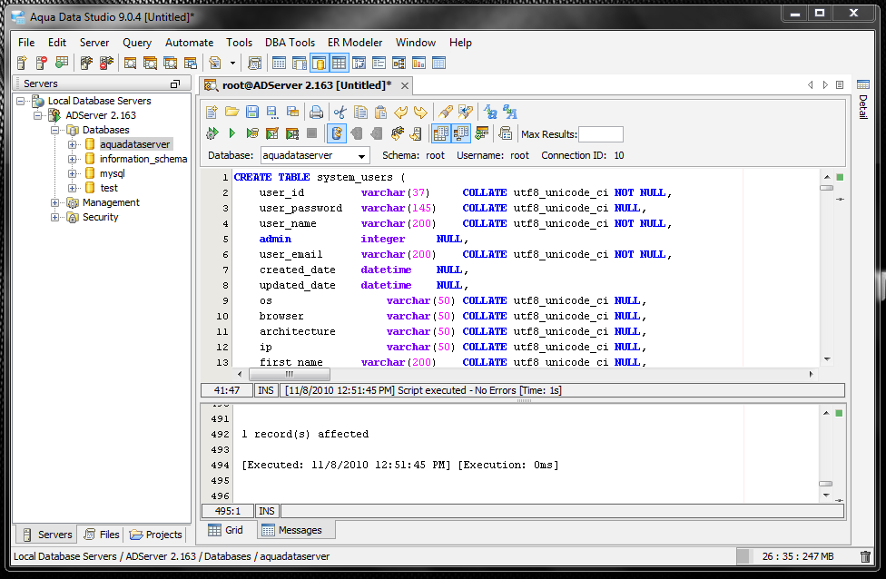 Below is an example of the aquadataserver_schema.sql script within Aqua Data Studio. After the SQL script is executed, all of the needed schemas are created and ready for use.