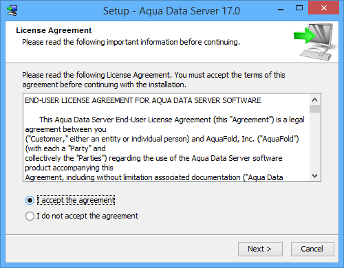 Download the Aqua Data Server installer EXE file from http://www.aquafold.com/aquadataserver_downloads.html to the desktop and double click it.