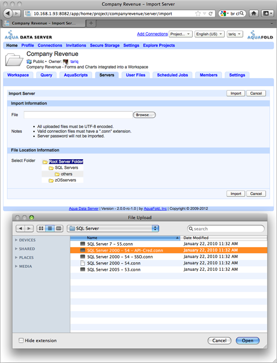 The Import Server button opens a dialog for importing server registartion settings (.conn files) from the file system. The Import Server action in Aqua Data Server is designed for uploading .conn files from Aqua Data Studio. These files are typically located in the <USER_HOME>\.datastudio\connections folder on the local hard drive where Aqua Data Studio is running.