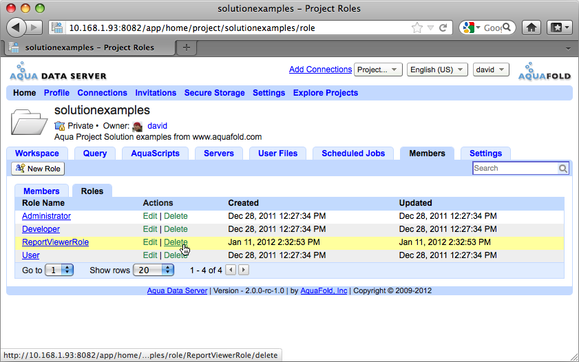 Each time a new project is created Aqua Data Server automatically creates 3 project roles within the newly created project. These are "Administrator", "Developer" and "User".