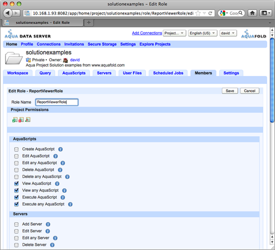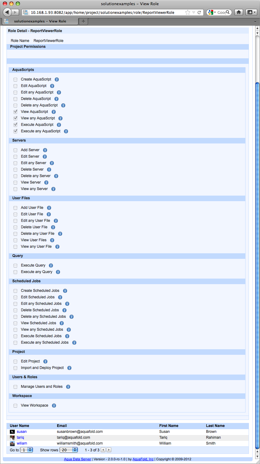 | Developer | This role grants view, create, edit, delete and execute access to objects owned by that user. Objects owned by other users will not be visible to this user. You might choose this role for developers who are creating AquaScripts. |