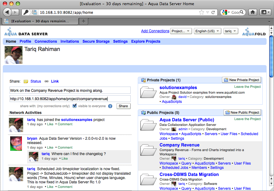 Network Activity is displayed on the left-hand side of the User Home page and gives continuous updates on other users' activities. Within it, it's possible to respond to posts with comments, or "Like" the posts of others. For more on what's possible in the Network Activities, see the Connections, Collaborative and Personal Tools section. Depending on the settings of other users, you can view: what projects a user joined, comments other users have made within their Network Activities, edits made to user profiles and the status updates others have shared.