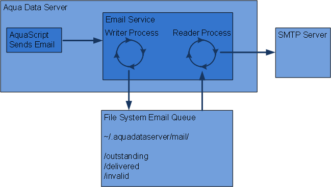 A background thread processes each email in the queue and sends them to the configured SMTP server. If the SMTP server is down, the email engine will retry periodically to send the emails. The email engine saves all outstanding emails to disk so that no emails are lost in case of server shutdown. Upon successfully sending an email, the engine can archive the email if the option is enabled.