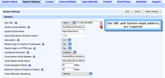 This step is for configuring Aqua Data Server for your particular environment once the application has been successfully launched. Configuration is performed on the Admin -> System Settings tab.