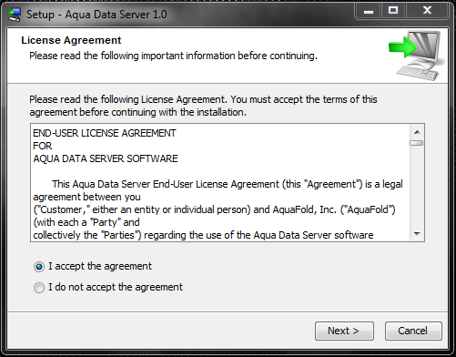Download the Aqua Data Server installer EXE file from http://www.aquafold.com/aquadataserver_downloads.html to the desktop and double click it.