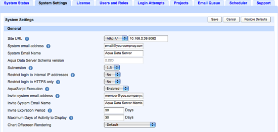 This step is for configuring the Aqua Data Server for your particular environment once the application has been successfully launched. Configuration is performed on the Admin -> System Settings tab.