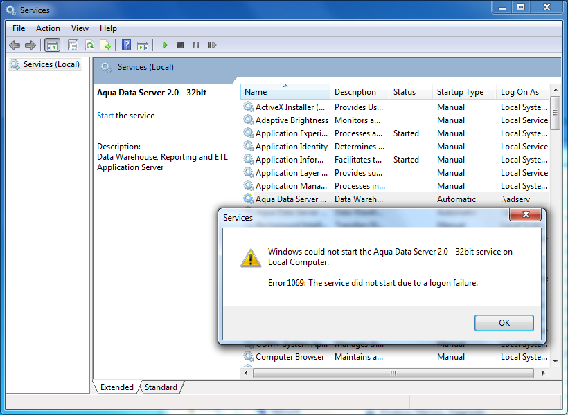 Manually run the Aqua Data Server service by clicking Start->Control Panel->System and Security->Administrative Tools->Services right clicking on the Aqua Data Server service and selecting Start.