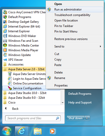 To edit the Memory Max (the amount of memory the JVM will allocate from the OS for use by Aqua Data Server) use the Service Configuration by clicking on Start-> Programs -> Aqua Data Server -> Service Configuration (be sure to right click and 'Run as administrator' if you are in Windows Vista or Windows 7).