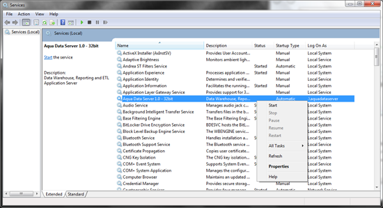 Manually run the Aqua Data Server service by clicking Start->Control Panel->System and Security->Administrative Tools->Services right clicking on the Aqua Data Server service and selecting Start.