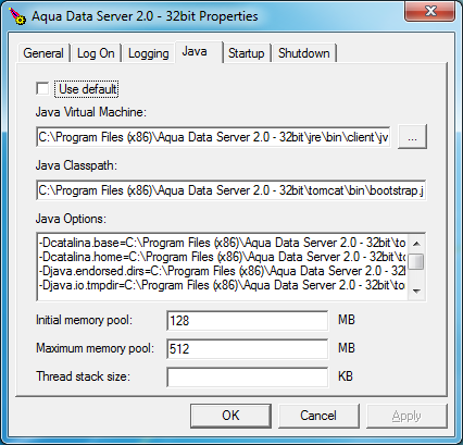 Once the Service Configuration window appears, click the Java tab and increase the value in the Maximum Memory Pool field and click OK. The Aqua Data Studio Windows Service must be restarted for this change to take affect.