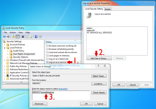 Grant rights to the user to Log on as a service by clicking the Start Menu and typing secpol.msc and pressing enter to launch the Local Security Policy editor.