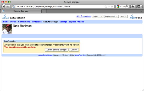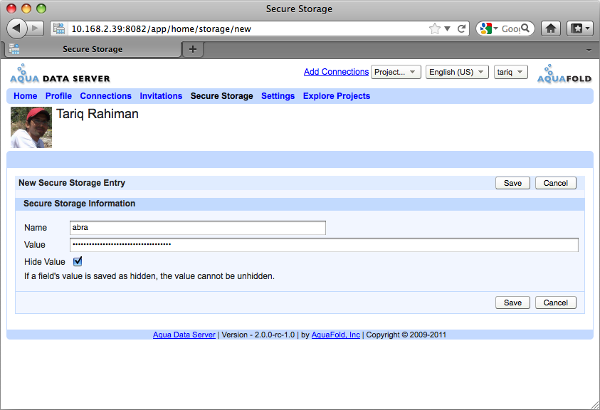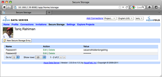 When writing AquaScripts you might have a need to authenticate with a 3rd party system such as an email server. It is not recommended specify the password in the AquaScript because it would be there in plain text and anyone with access to that AquaScript could view it. To address this need, Aqua Data Server has created the concept of Secure Storage fields. Secure Storage fields are name value pairs where the value is stored in an encrypted format. You can create and manage these fields in the Secure Storage tab. These fields are only accessible by you and are not shared amongst other users. Even system administrators cannot access your secure storage fields. See Basic Concepts: Secure Code to learn more about how to use these fields in your AquaScript code.