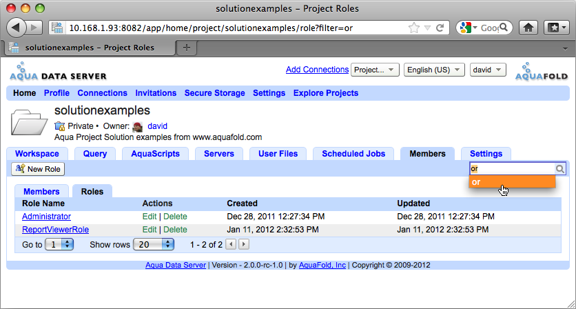 Type in your search text in the Action Bar and press enter. Aqua Data Server performs a case insensitive search against the role name and lists only those roles which match the search text. e.g. Using the search term "own", will return roles with names like "Project Owner" and "owner."