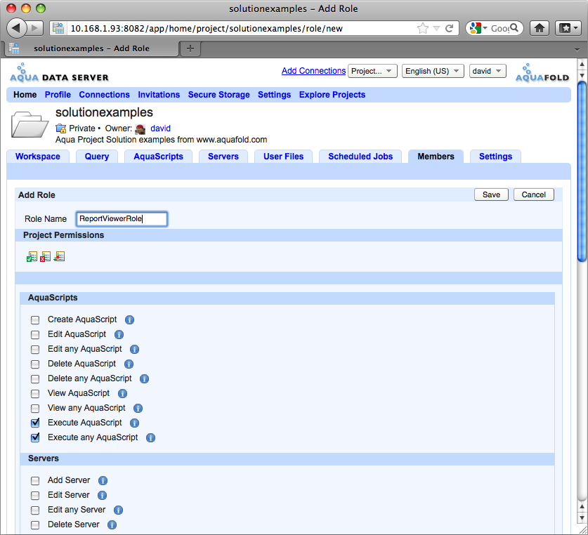 | Developer | This role grants view, create, edit, delete and execute access to objects owned by that user. Objects owned by other users will not be visible to this user. You might choose this role for developers who are creating AquaScripts. |