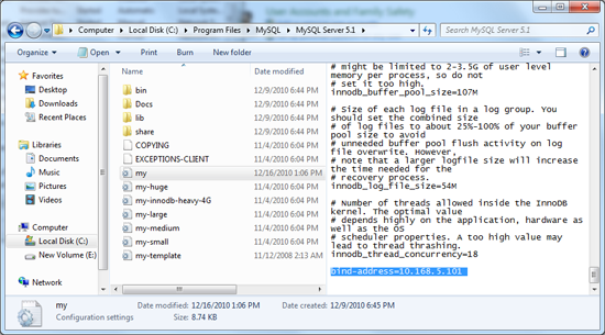 NOTE: It is important that the MySQL configuration have its bind-address set to the IP address of the computer it is installed on, within the my.ini file. See this link http://dev.mysql.com/doc/refman/5.1/en/option-files.html for location of the configuration file and the order that MySQL reads the configuration information.