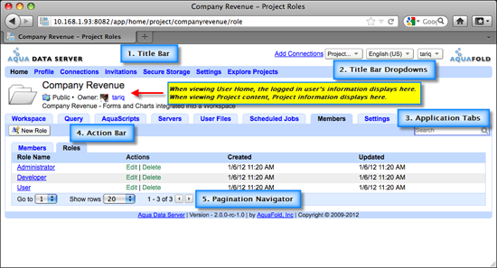 The Title bar contains the Home, Profile, Connections, Invitations, Secure Storage, Settings and Explore Projects (and the Admin link for System Administrators) along with the Title Bar Dropdowns.
