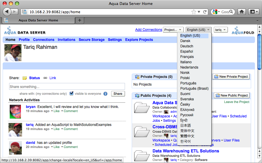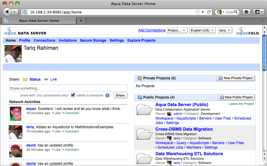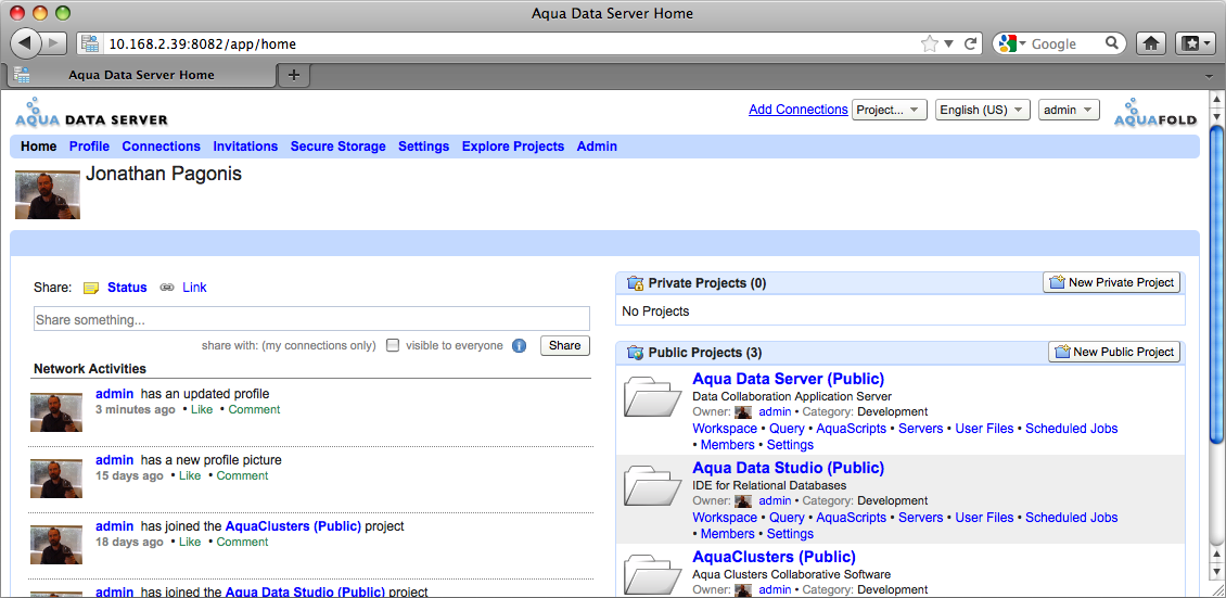 The User Home displays the Network Activities feed on the left and a user's Projects list (subdivided into Public and Private projects) on the right. In the screenshot below, a user without System Administrator capabilities is viewing his User Home. No Admin link is visible for this user.
