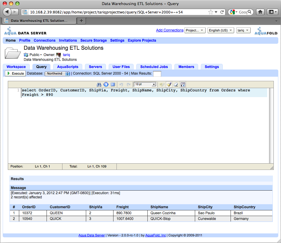 The Action Bar is directly beneath the Application Tabs in the blue stripe, and displays context-sensitive buttons and search forms. In the following screenshot, the view is of the "Data Warehousing ETL Solutions" project's Query tab. Notice that database information displays in the Action Bar. A user can Execute, select a database within the connection using a dropdown, and select the Max Results displayed for the query executed. Clicking the Execute button in the Action Bar executes the query and displays the results.