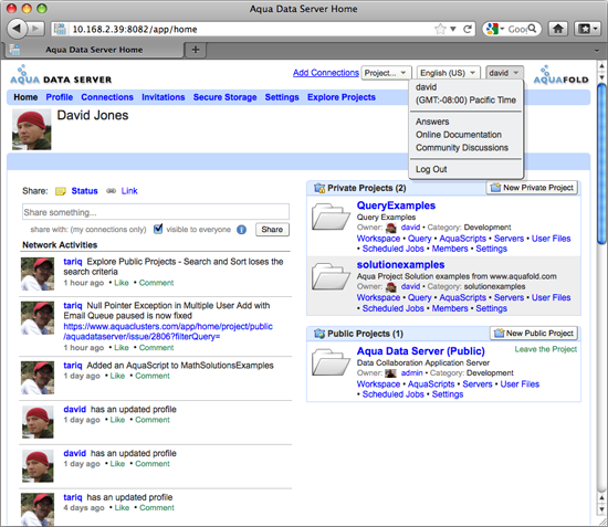 The third dropdown is the Account Dropdown which indicates the current username, allows changing the current user time zone, navigates to the current user profile. Within it are quick links into AquaCluster Answers, Online Documentation and Community Discussions for Aqua Data Server. The last link in the list, Log Out, logs out the current user.