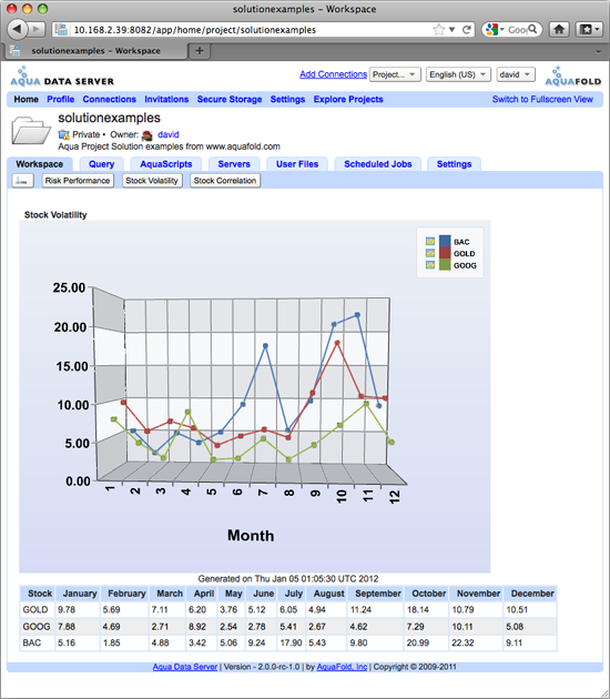 When a user navigates into a Project by either clicking on a particular project in their Projects list, or by using the Projects Dropdown, the Project Name, Category and Description along with the Project Image are displayed (if one has been uploaded). Below, a user who does not have permissions to see the Admin tab has navigated into the solutionexamples project. The solutionexamples Application Tabs this user has permissions to see are Workspace, AquaScripts, Servers, User Files, Scheduled Jobs and Settings.