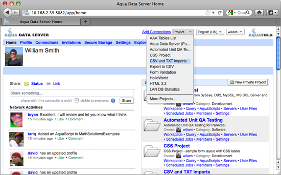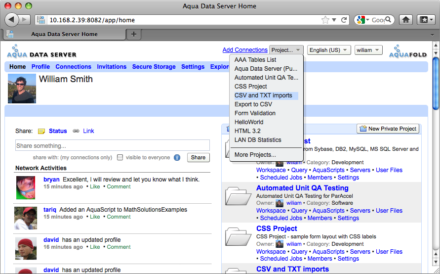 There are three dropdowns at the top right of the page once a user logs in. The first dropdown, to the right of Add Connections is the Project Dropdown that lists all of the projects the current user is a member of. This is the fastest method of navigating from one project to another. Clicking on a Project in the list opens it.