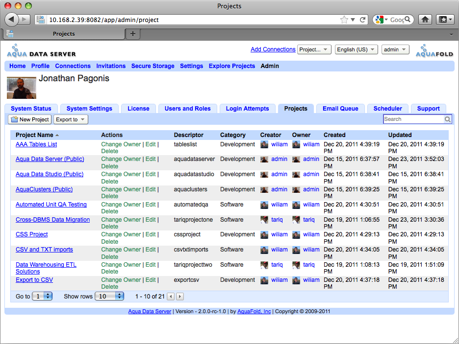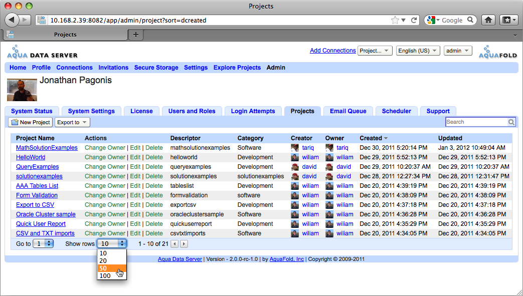 When large lists are generated Aqua Data Server paginates the results and displays a Pagination Navigator at the bottom of the list. Using the Pagination Navigator, it is possible to go to a page of results, select how many rows appear per page, or click forward and back through the pages. In the screenshot below, we are viewing page 1 of a list of Projects. We currently show 10 rows per page. The cursor is selecting from the dropdown to swap from showing 10 rows per page to showing 50 rows per page.