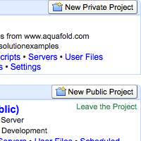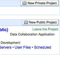 Projects are organized as either Public or Private on the User Home page. Users with the Create Project System Permission can use the New Public Project or New Private Project buttons to quickly create new projects.