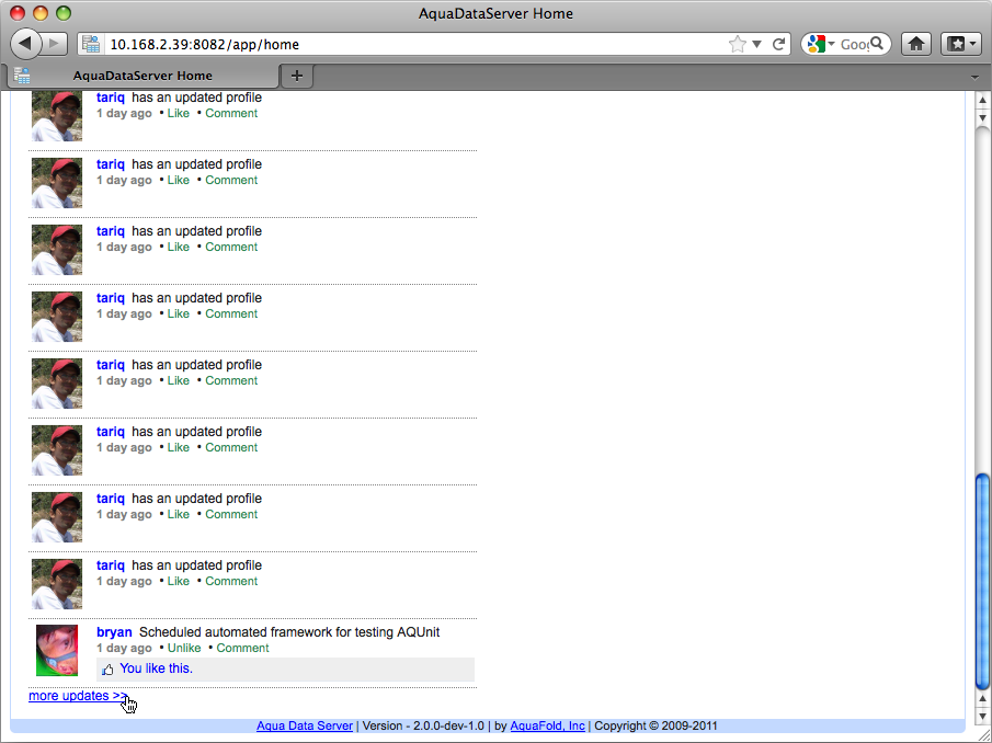 When viewing Network Activity on the User - Home page, if there is a lot of activity, you can see older activity by scrolling to the bottom of the page and clicking "More updates" to view it.